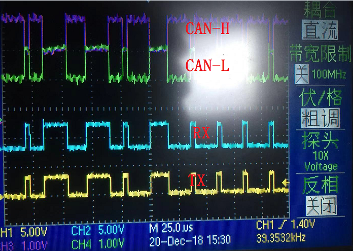 在出现CAN通讯故障时,用示波器捕获CAN信号波形,如下图,通道1:DSP-TX,通道2:DSP-RX,通道3:CAN-H,通道4:CAN-L,信号可通过收发器传播,初步判断不是收发器问题。通过示波器对比有故障及没故障的CAN总线波形,可以看到通讯速率都保持在250kBit/s,且示波器抓到故障时CAN总线上有很频繁的相同CAN数据,CAN波形并没有受到明显的干扰,好像是由于这个CAN数据的帧没有被其它的CAN节点应答的想象。