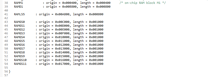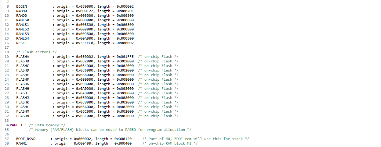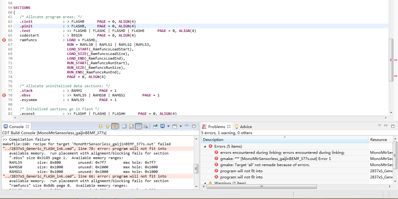 您好,我在用F28377s烧写电机程序的时候,flash 的cmd文件出现问题,在网上查了下说把存储空间改大即可,但是我把其他page0或者page1里没有用到的内存分给这两部分时还是出现错误,不知道为什么,下面是内存分配图和出错的地方。