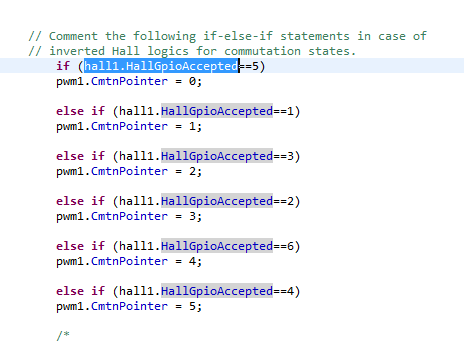 但是例程中PWM开启状态pwm1.CmtnPointer似乎与HallMapPointer没有关系,pwm1.CmtnPointer还是根据hall1.HallGpioAccepted的状态来进行对应的赋值。如下图: