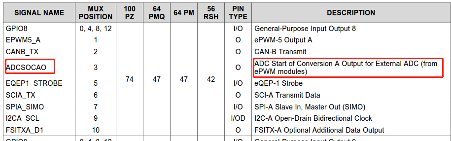 目前使用TMDXDOCK280049M开发板进行ADC功能调试,EPWM5周期TBTRD为1000,当TBTRD=CMPA=500时拉低作为翻转,形成50%duty的波形,CMPB=800作为SOCA触发源,ADC采样触发源为CMPB,现在想测量AD采样点是否遵循CMPB的数值在PWM80%触发采样,刚开始配置了GPIO8复用ADCSOCAO功能: