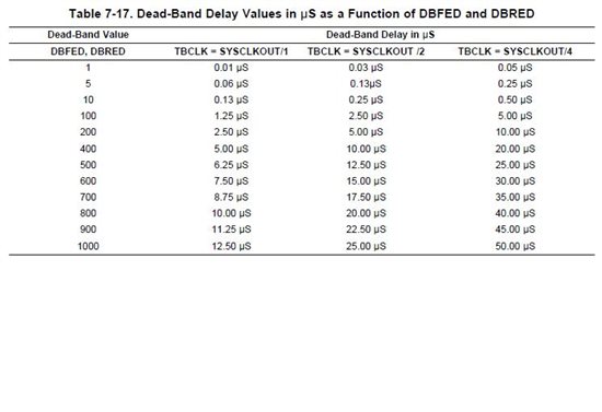 死区时间等于 "死区寄存器DBFED/DBRED“ 乘以 "实际使用的时钟TTBCLK“