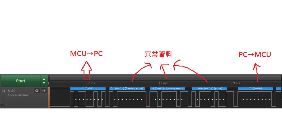 有一次是PC→MCU傳輸一個Byte錯誤,應該是0xFF但是邏輯分析儀解出來是0xFE,之後MCU這邊的RX中斷就不會再觸發了。