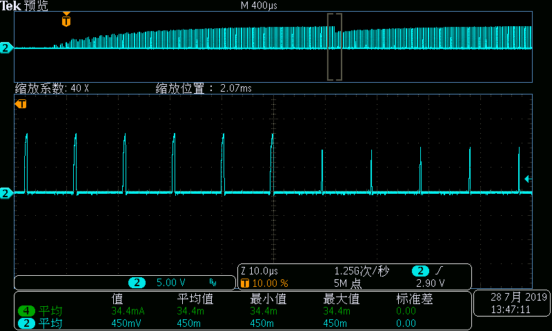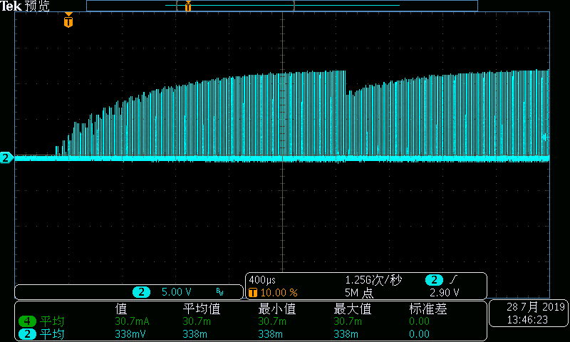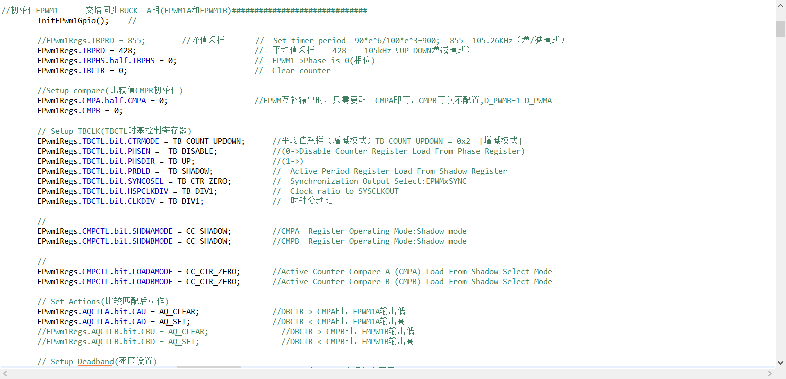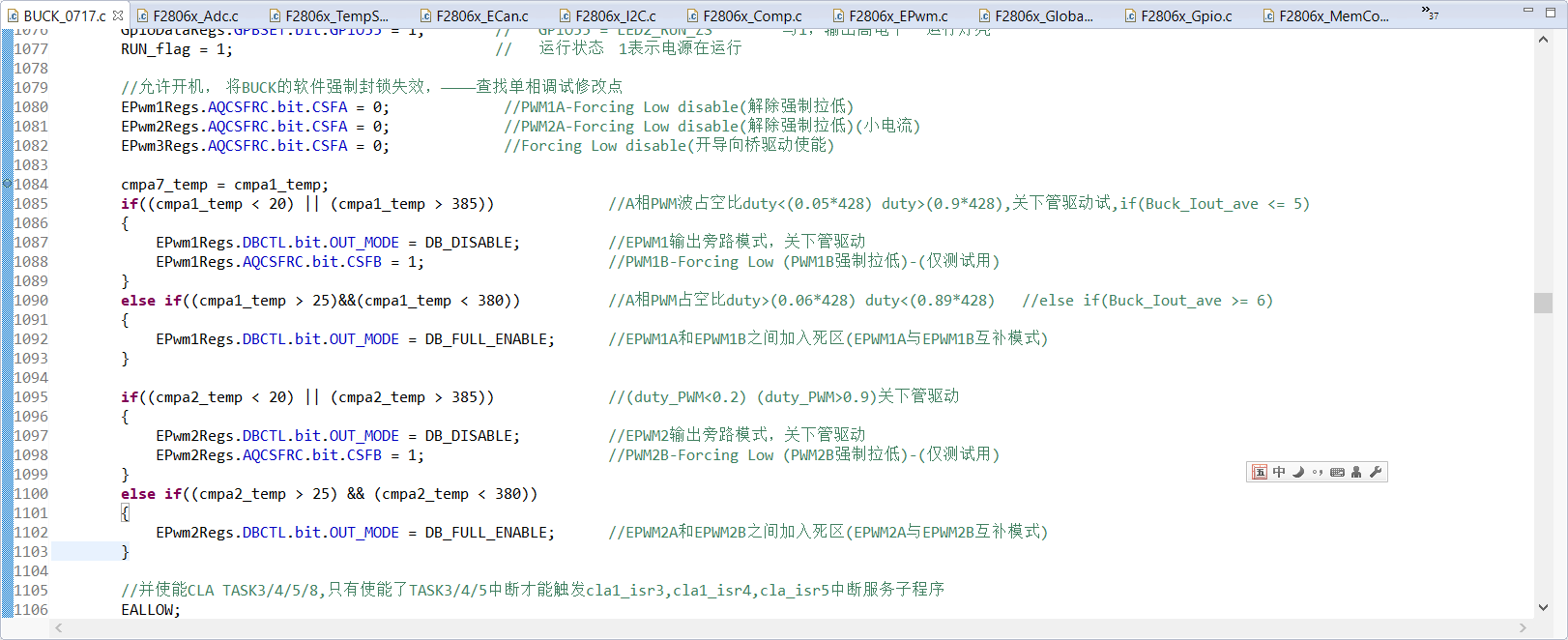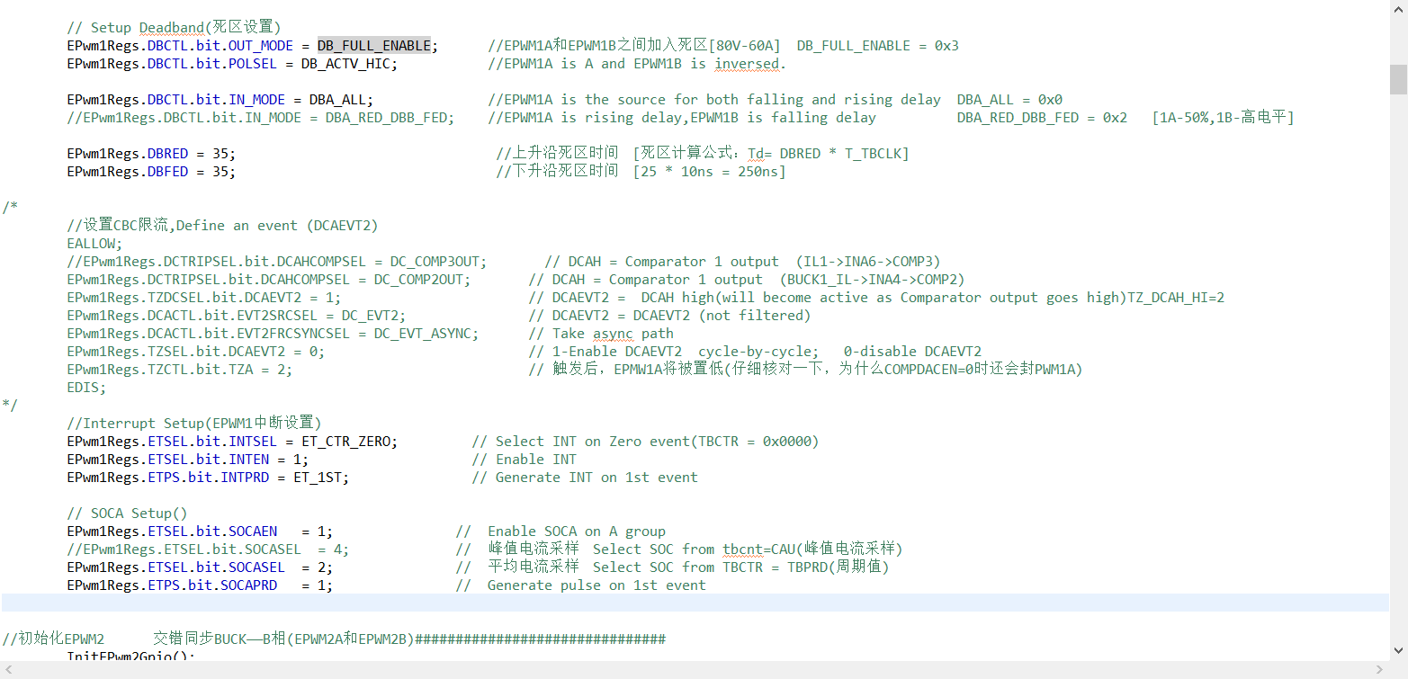 第一张图片是在中断函数里面对EPWM的DB输出模式进行更改配置的程序代码,第二张图片是测试PWM输出时,在旁路模式和互补模式切换点上,PWM波的占空比有跌坑,第三张图片是跌坑的细节,明显看到PWM的占空比又从0开始了。但是CCS在线仿真,在切换点上,CMPA的值并没有清零。