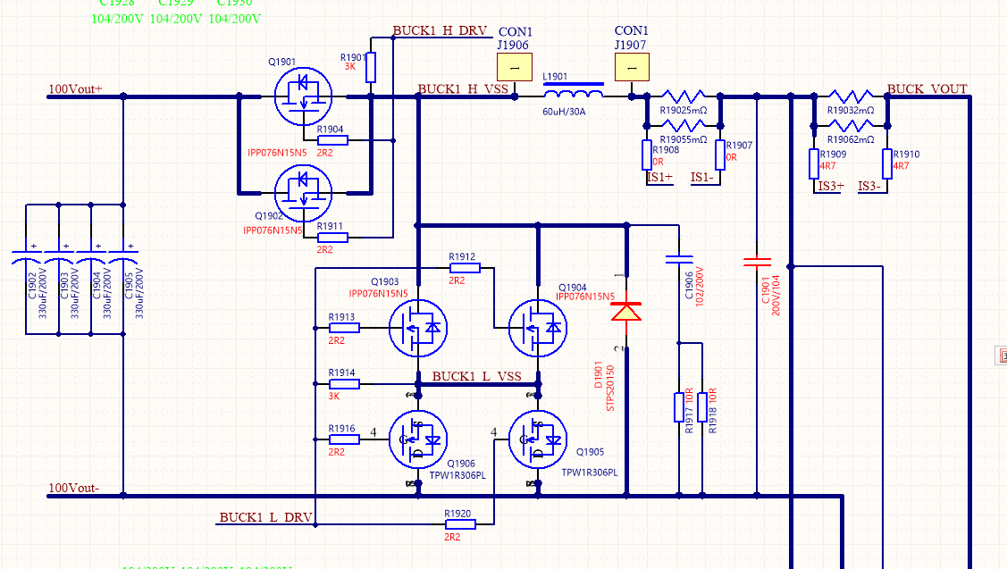 电路图如下,同步BUCK,输出电流30A,设计要求:小占空比(对应小输出电流)时,关掉续流管驱动,让并联的二极管续流;大占空比时,开下管驱动。