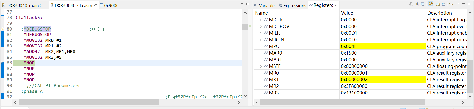 由于对CLA不熟,因此弄了一个测试代码。按照语句执行顺序,执行完 MMOVI32 MR0 #1后果,右侧寄存器的值应该显示1,下面的几个语句执行完,寄存器也应该同步显示 ,但实际单步执行时,发现寄存器显示的数值滞后。