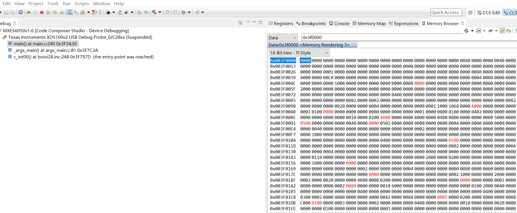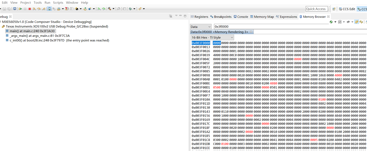 只有用户需要配置时才会更改用户数据区。 正常运行时不会写flash。 程序处于仿真状态,程序还没有执行,ccs6.1 查看 用户数据区,数字在变