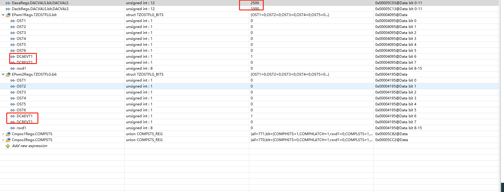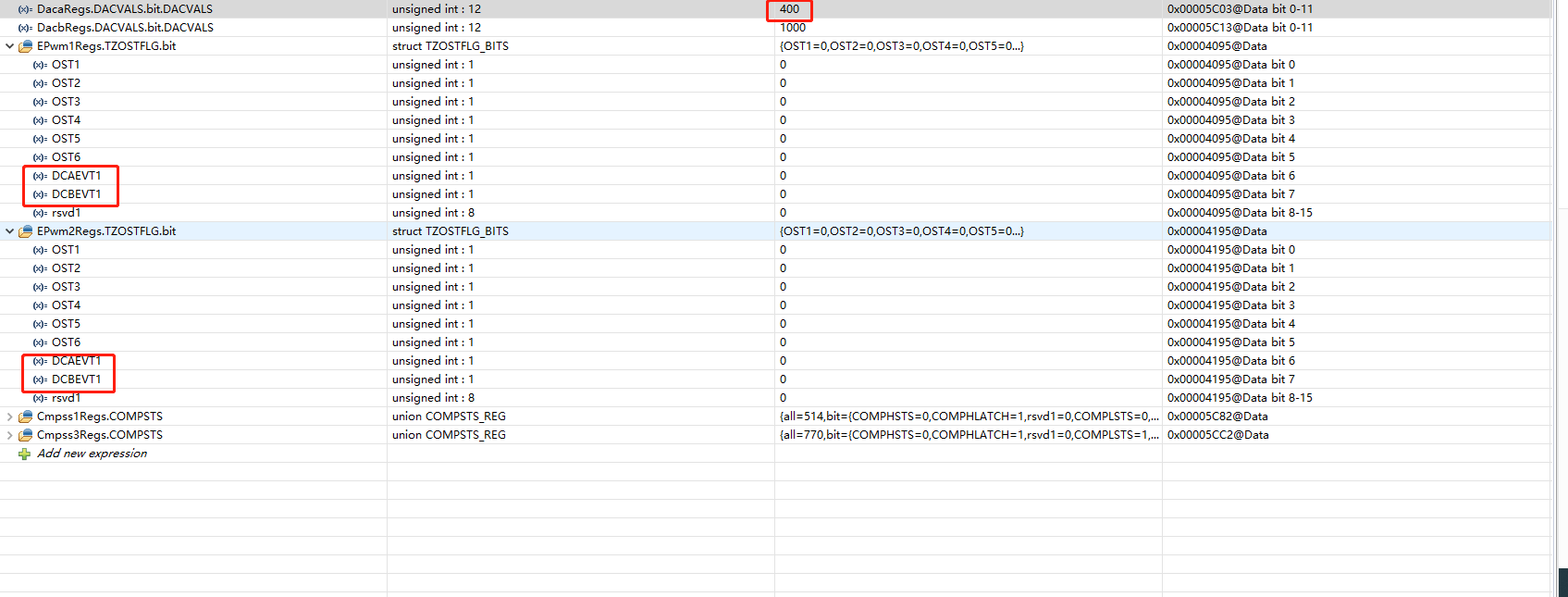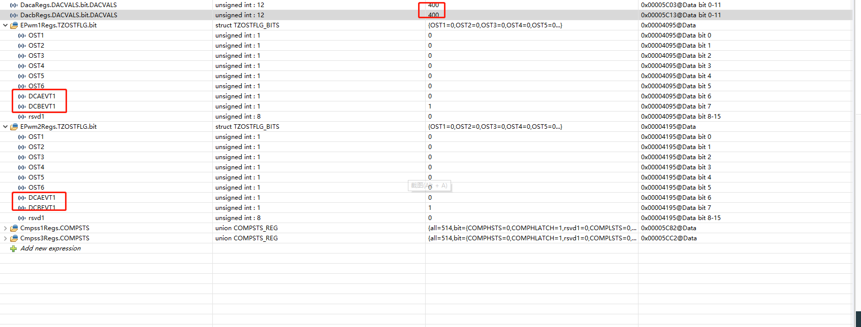 当任一CMPSS输入大于超过CMPxH DAC设定值时能够触发DCAEVT1,EPWM1、EPWM2都停止。