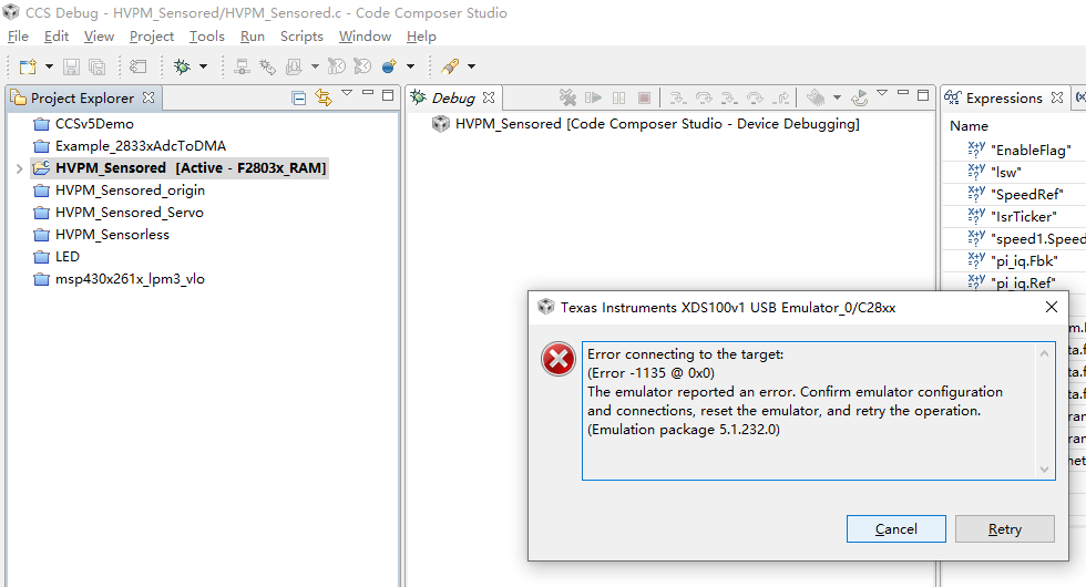 我有两个TMDSHVMTRPFCKI套件,之前一个配置好了可以与CCS正常连接,但是换了一个新的就不能了,出现了一下错误,为什么呢,请问怎么解决?