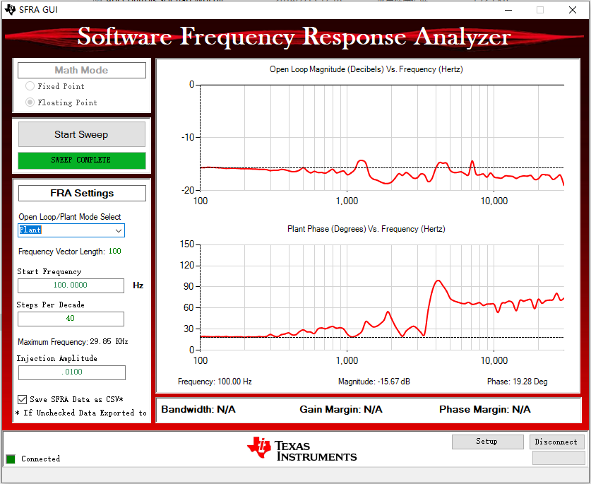 此图是官方例程中测得的buck电路的bode图。我自己按照例程中的代码进行调试,首先进行开环测试,测得的结果如下图所示: