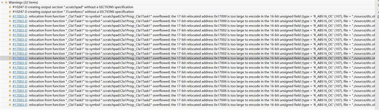 <a href="file:/D:/software/TI/ccs/ccsv6/tools/compiler/dmed/HTML/17003.html">#17003-D</a> relocation from function "_Cla1Task2" to symbol ".scratchpad:Cla1Prog:_Cla1Task2" overflowed; the 17-bit relocated address 0x17000 is too large to encode in the 16-bit unsigned field (type = 'R_ABS16_OC' (107), file = "./source/dtc.obj", offset = 0x000000e0, section = "Cla1Prog:_Cla1Task2") dtc.cla /DTC_test_5/source line 197 C/C++ Problem