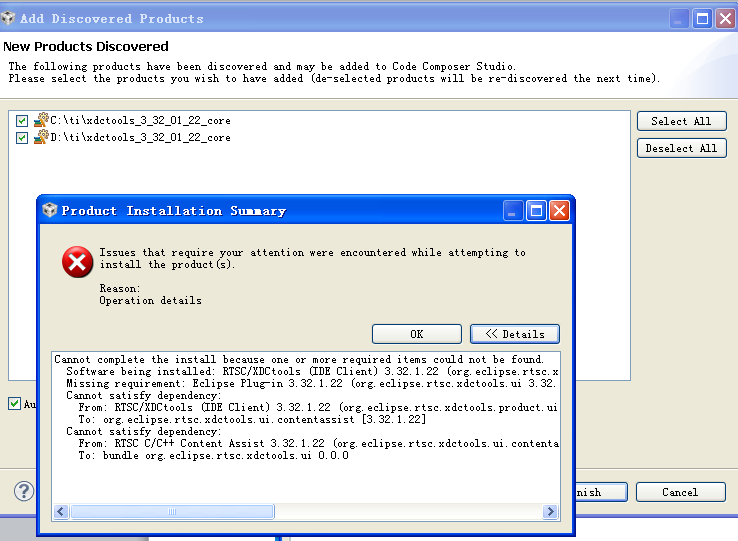 Missing requirement: Eclipse Plug-in 3.32.1.22 (org.eclipse.rtsc.xdctools.ui 3.32.1.22) requires 'bundle org.eclipse.rtsc.xdctools.buildDefinitions.XDC.minimal 0.0.0' but it could not be found