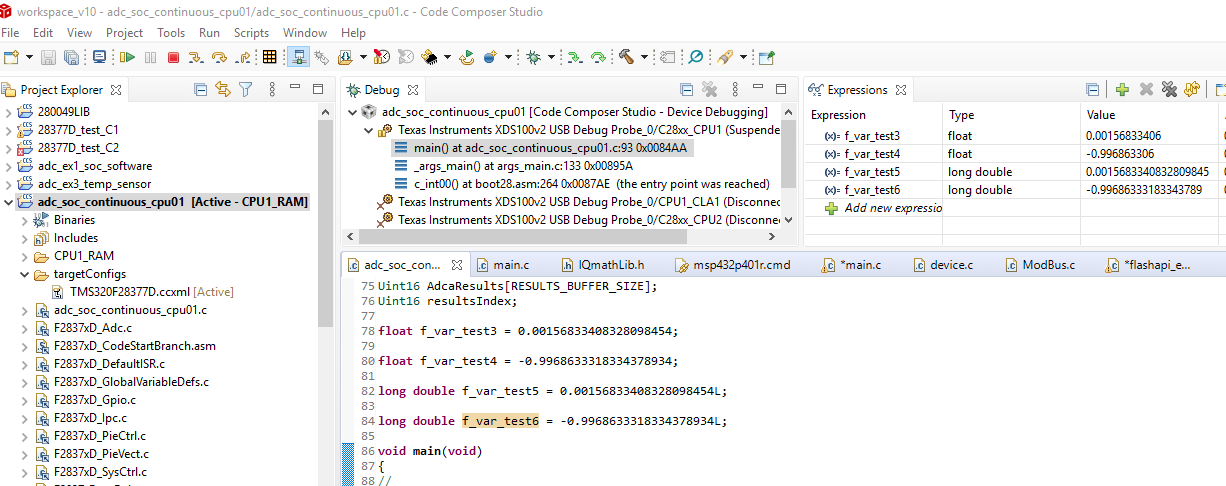 在DSP28377D中对两个float型变量进行赋值,连上仿真器后运行查看变量的值和赋的初值有差异,如下图上面为赋值,下面为CCS中查看的变量值,一个是小数点第11位有差异,一个是第8位有差异,这个是啥原因?另外float型的精度是到小数点后几位?