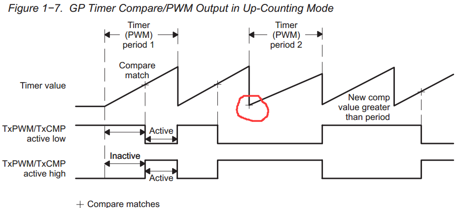 请教下各位,手册SPRU065E中的图2-4中我用红色圈起来的那部分波形输出是不是画错了?如果下一周期的比较值为0,如果是高有效的话,不应该是在周期匹配的时候电平不变,然后整个周期都是高电平吗?
