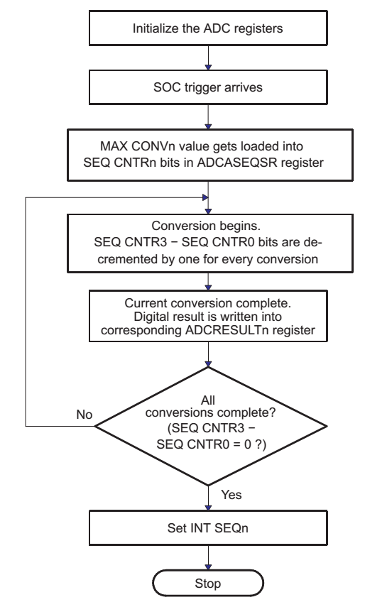 顺便再问您个问题吧,2812的ADC手册里有这么个流程图。在Uninterrupted Autosequenced模式下,需要转换的通道数为MAX CONVn + 1,转换伊始SEQ CNTR载入的值是MAX CONVn,那么当SEQ CNTR自减为0的时候,实际上已经完成的转换通道数只有MAX CONVn个呀,应该还差一个通道没有转换呀,为什么流程图中却以SEQ CNTR==0为条件把中断标志位置位了呢?