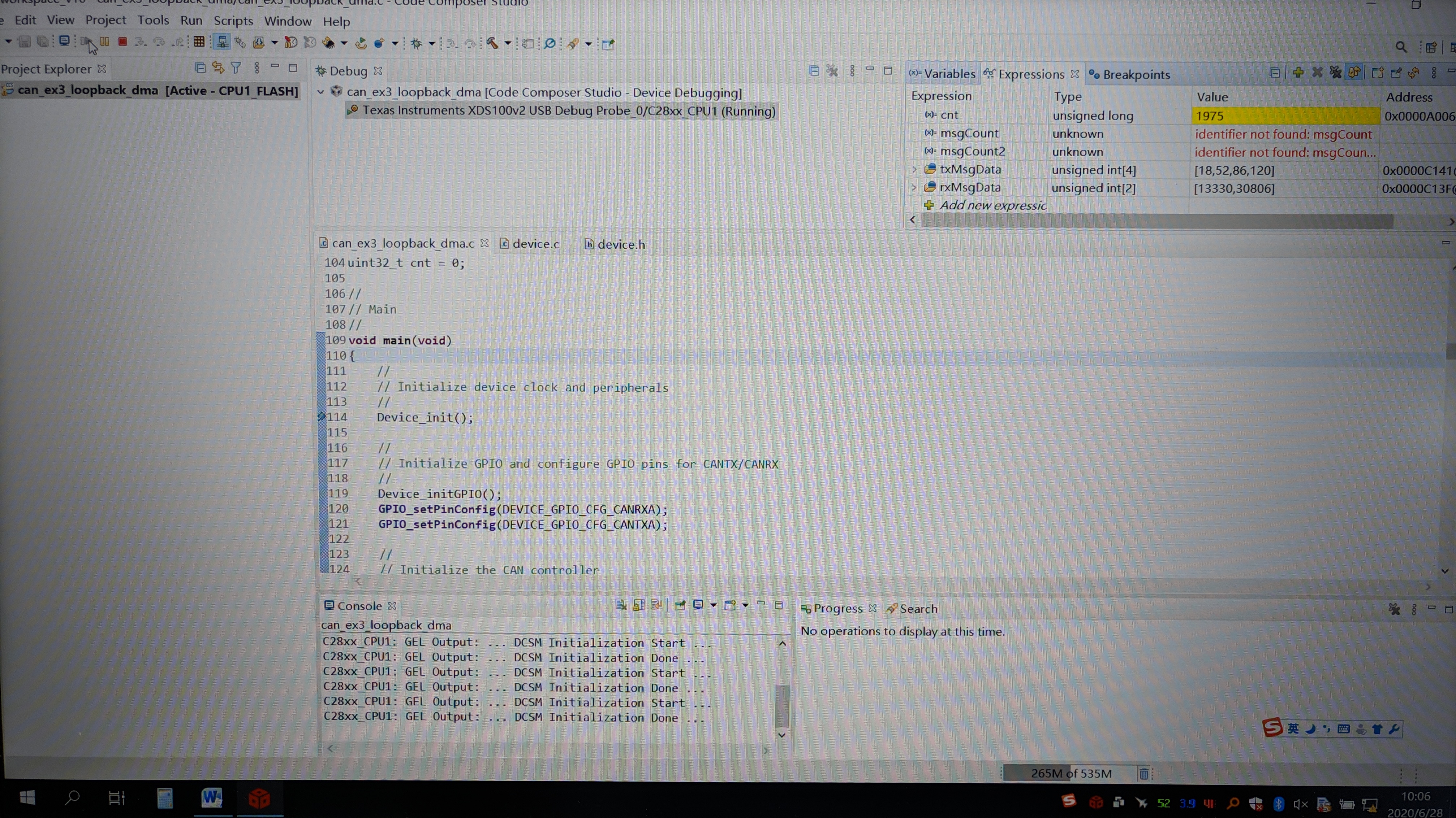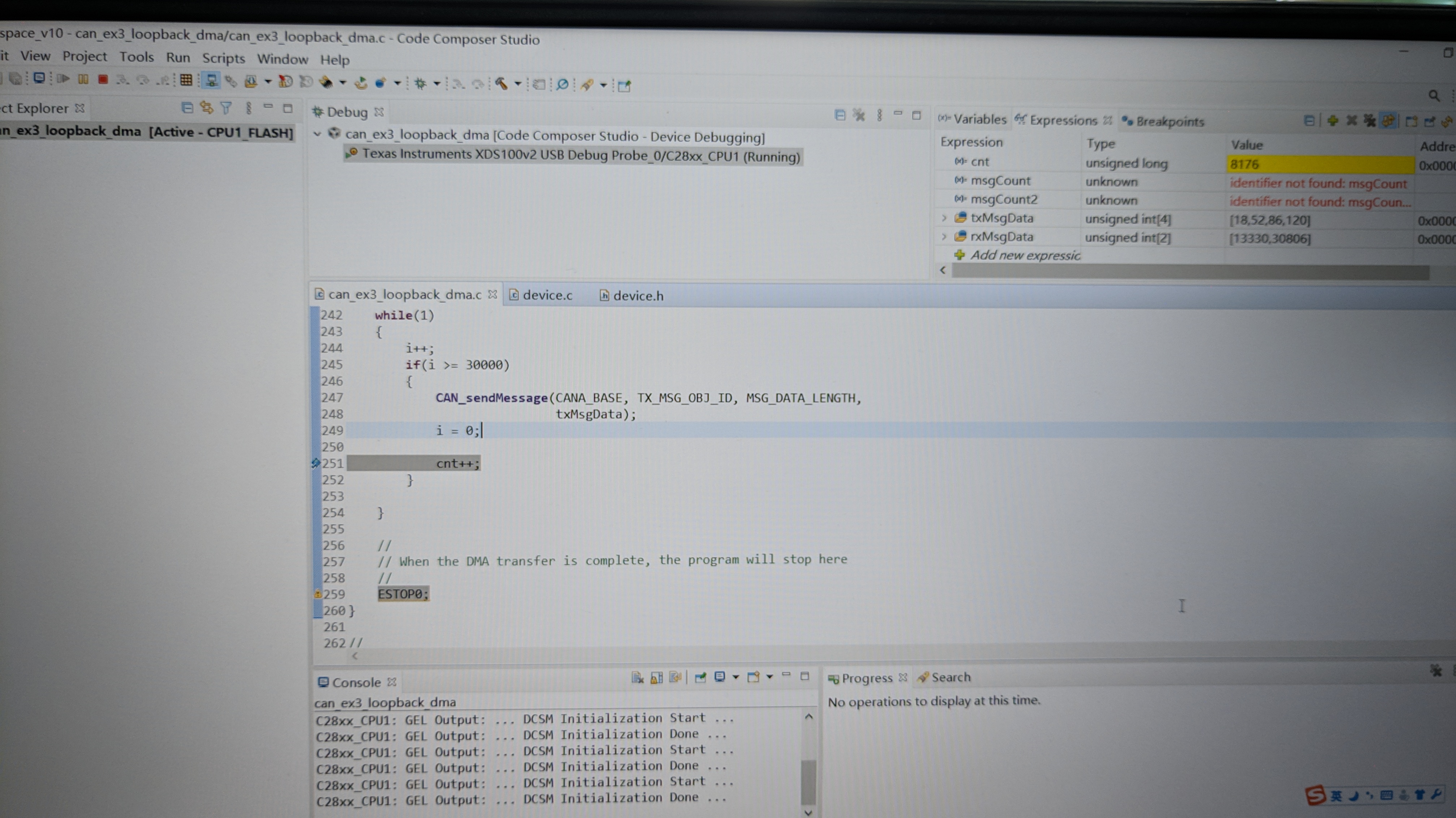 版本CCS10.1,开发板是controlcard 280025C,程序是官方例程can_ex3_loopback_dma,我在主循环加了一个自增的变量观测,该变量是一直在变化的,说明程序已经跑到主循环了,但是为何断点不停呢? 把断点设在第一句话重新仿真也不停,求解?