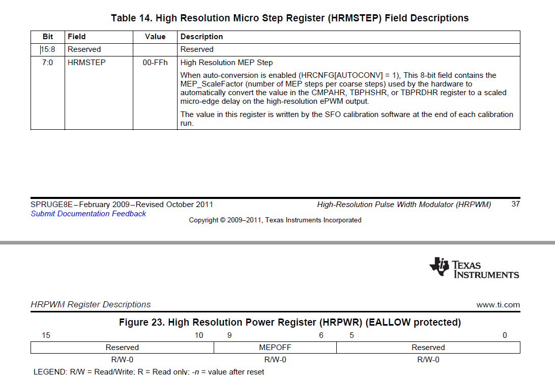 我的芯片是TMS320F280,看资料是有HRPWM功能,如果我想控制频率变化为1HZ的变化量,能实现么?因为我看资料的时候,当我的系统时钟是60MHZ,如果我想得到20KHZ的pwm信号,那么我的TBPRDHR的值为60M/20K=3000,可以实现,但是如果我想要20001HZ的pwm信号,如何设置这些寄存器呢?因为60M/20001=29985.007496,除不断。