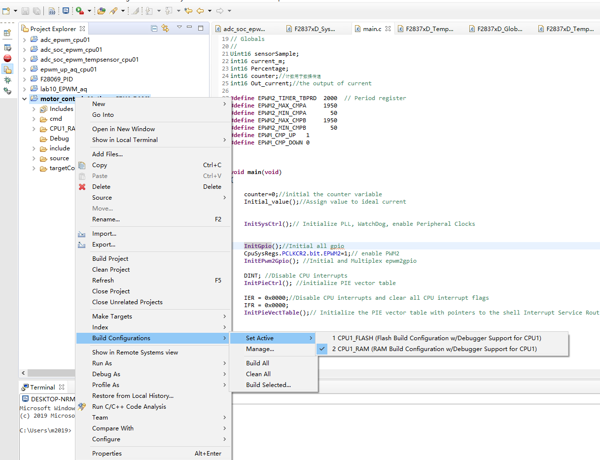 要将F28377D项目更改为从FLASH运行,如您可以在“ F2837x_SysCtrl.c”(函数InitSysCtrl())中的代码中找到“ #ifdef _FLASH”。您可以将“ _FLASH”定义为预定义符号(properties => C2000 Compiler => Advanced Options => Predefined Symbols => Pre-Define NAME)。如果定义了_FLASH,则函数“ InitSysCtrl”还将调用memcpy和InitFlash()。而后将链接器命令文件“ 2837x_RAM_lnk_cpu1.cmd”替换为“ 2837x_FLASH_lnk_cpu1.cmd”。