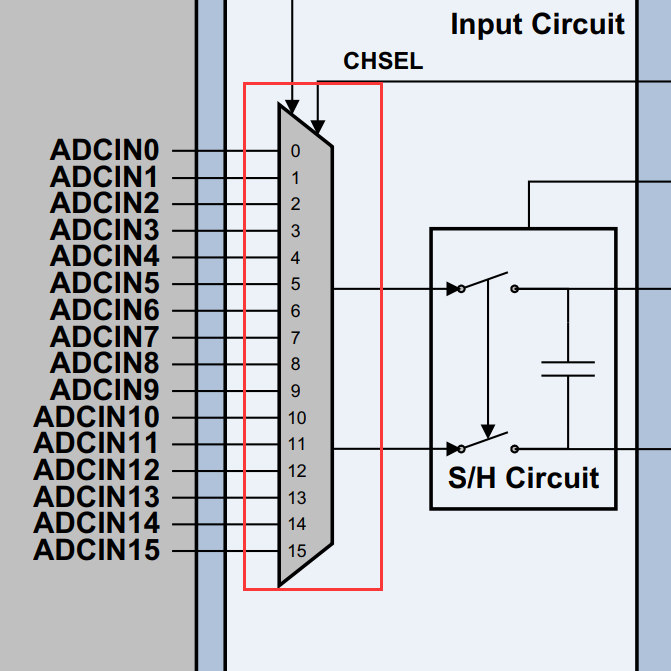 • 1. 这里所说的模拟开关切换,其实是指DSP芯片内部ADC模块的通道(x)切换到其它通道(y)的切换开关,如下面图框起来的部分