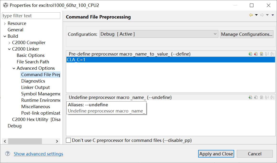 // Project Properties -> C2000 Linker -> Advanced Options -> Command File