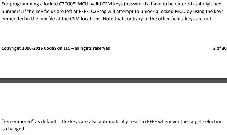 我现在有一个新的芯片DSP28034,用C2PROG烧写了一个加了密的程序,但我先再烧写时,出现了芯片被锁。我尝试在C2PROG V1.8的Target configuration中Code security中输入密码,发现报error1015。输入的密码也是正确的。难道不能烧写带密码的芯片吗?