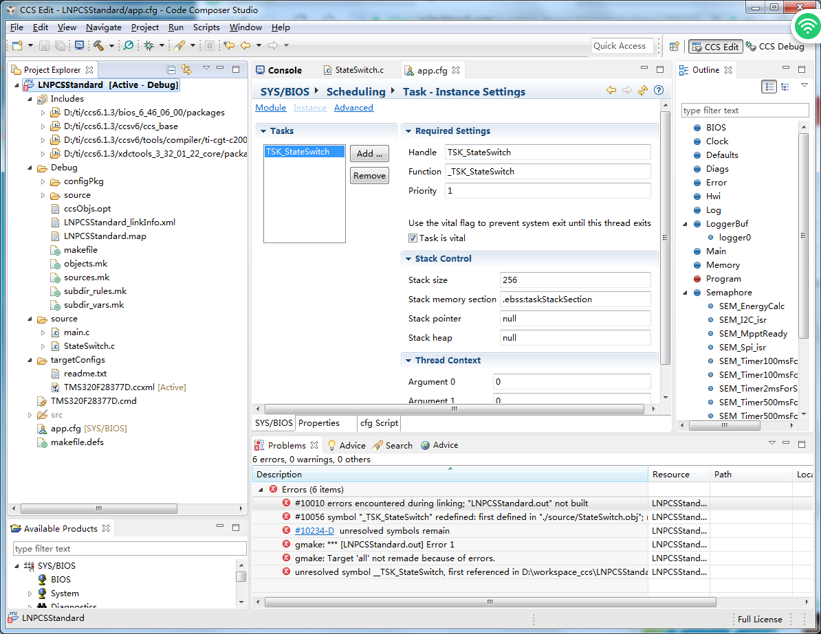 求助,关于建立SYS.BIOS 工程时,只添加1个任务,编译时报错。具体情况为: