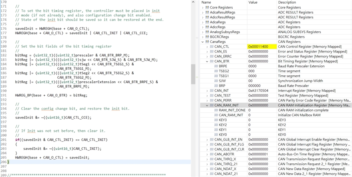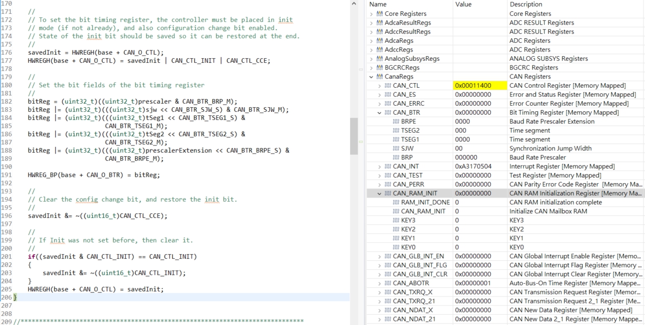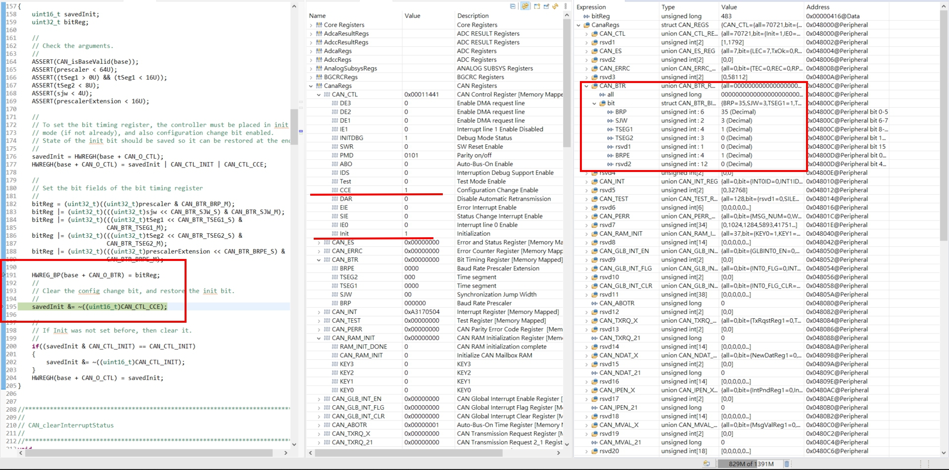 我在設定 CAN_BTR 發現沒有寫入 register ,之後是發現說 // If Init was not set before, then clear it. ,所以是沒有Init 成功。