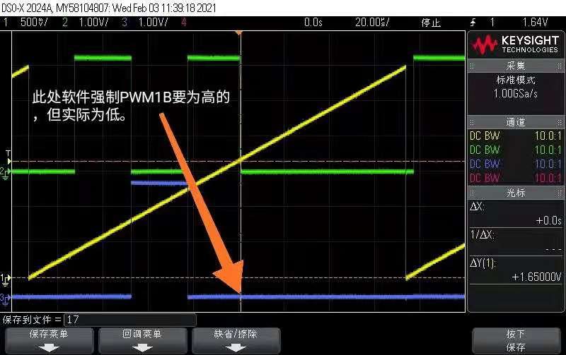 下图是没有使用数字比较器时的波形如下,PWM1A和PWM1B互补,是对的。