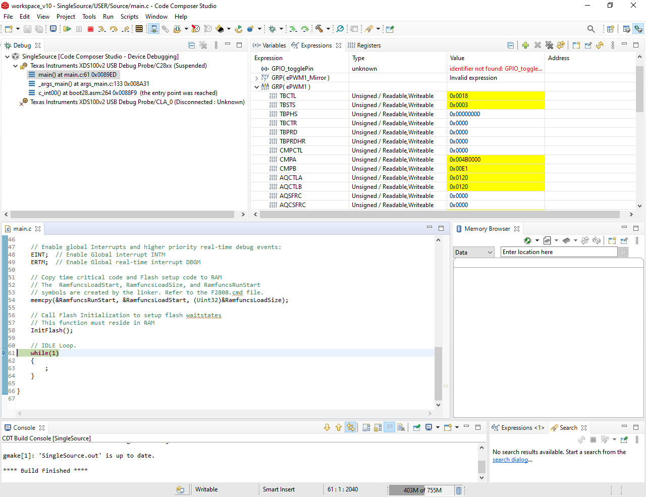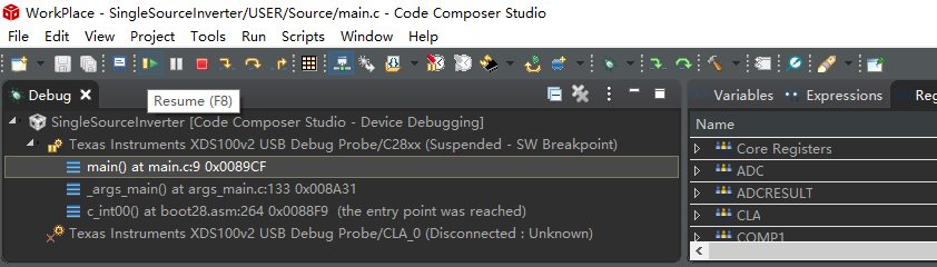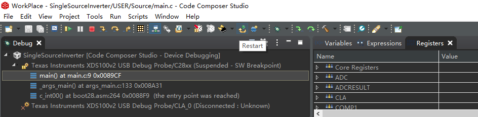对F28069进行调试时,直接点击Resume运行程序没有任何效果,需要先Restart一下,再运行才有效果;