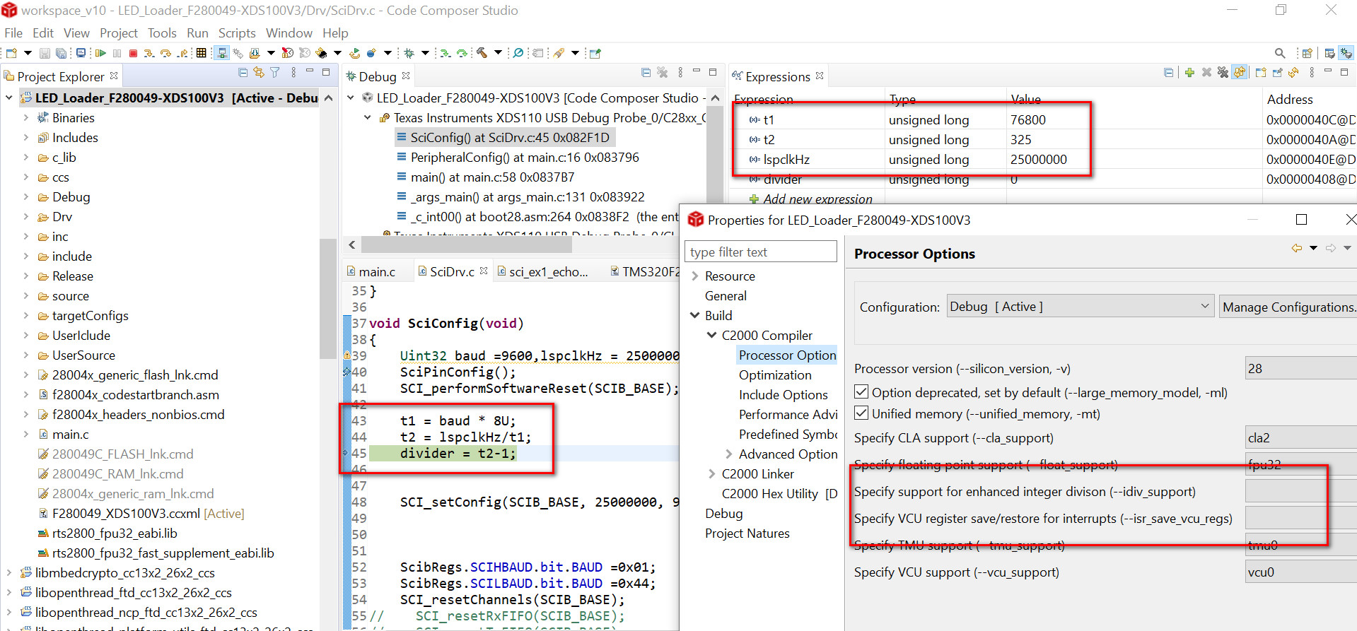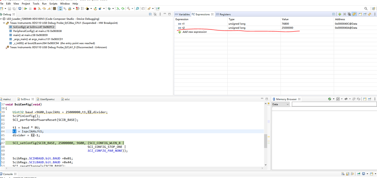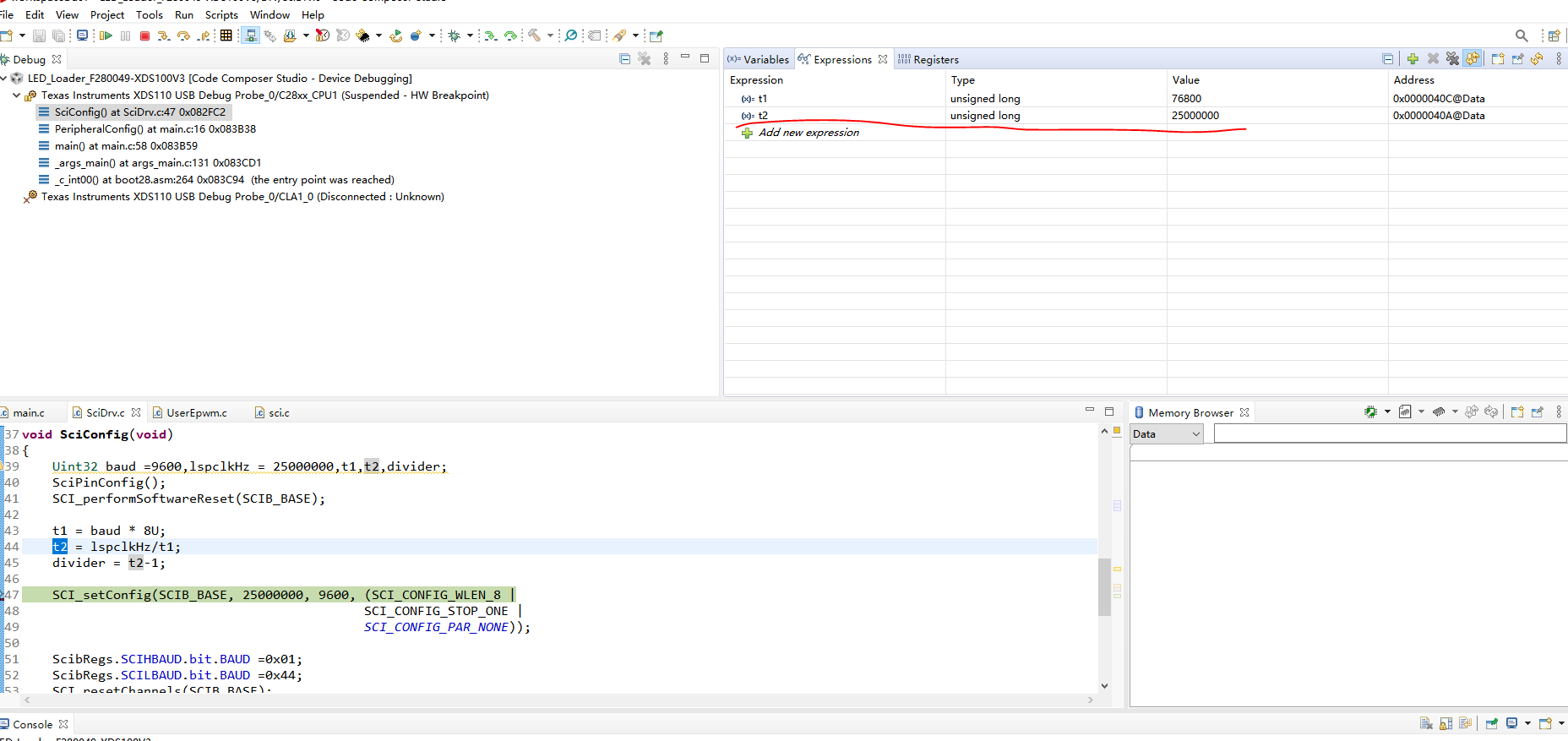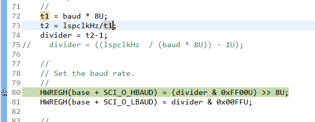 Sci调试过程中发现无论怎么弄都通信不上,用示波器看SCITX引脚发现波特率不对,检查BAUD寄存器发现寄存器中的值不对。SCI初始化是用的库函数。
