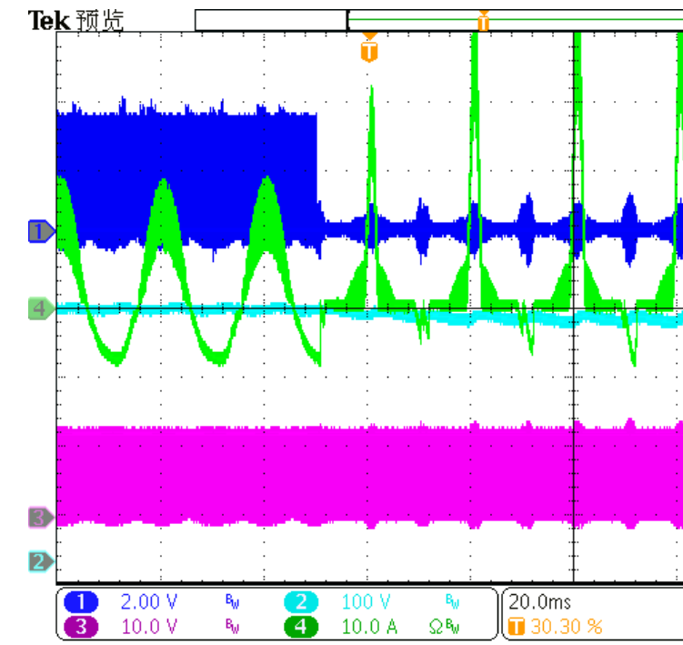 具体情况描述如下:我使用28035芯片的CLA task进行PFC电源环路运算,当我设计好环路后,实现尝试控制一个200V低压,电路均能正常工作,并且能加载至额定最大负载下;但是尝试将电源输出控制为额定高压400V输出时,电源空载加载至2A左右时均正常工作,但总是在负载稍微更大点时,芯片就跑飞锁死(我的判断标准是芯片没有进入中断程序,如图中的通道1),然后芯片PWM模块就进入free模式,以固定占空比发波直至保护。