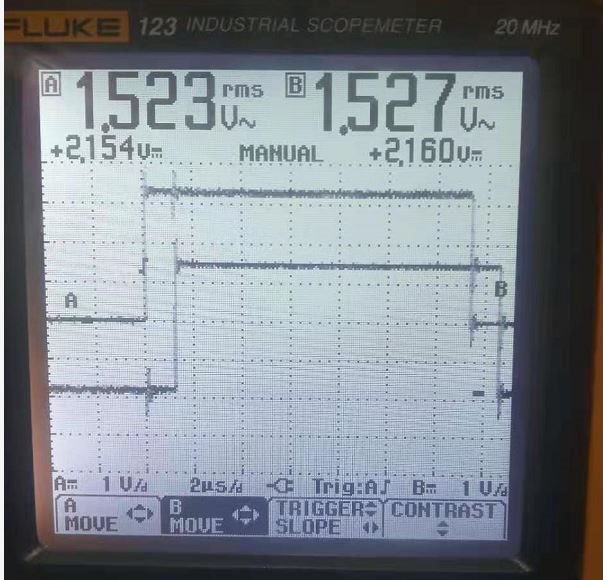 测试中,将PWM2与PWM1进行时钟同步,脉宽相同,目前滞后0度(后续需要滞后任意角度),由于是变频控制,周期寄存器的值在一直调节。