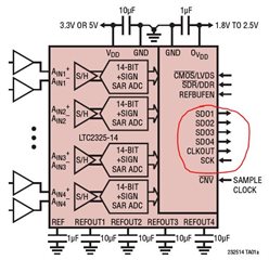 您好,我们想使用一个高速的AD,例如AD公司LTC2325的AD(由于没找到TI有SAR的AD类型达到4M采样率的),它是多个SPI数据输出口,但是共用一个数据输出的时钟(他还提供了一个输入的时钟,这样可以控制bit),我们用它连接28375,是不是使用28375的其中一个SPI作为主设备给AD发送参考时钟(控制bit),使用其它SPI作为从设备接收(从设备的时钟来自AD输出的时钟)。对于这种接口一般是这样使用吗,非常感谢!