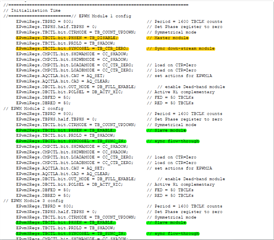 第二、两个代码里都将ePWM单元的PHASE EN使能了((*ePWM[ch1]).TBCTL.bit.PHSEN = 1;),其实作为master的ePWM1是不是应该不使能