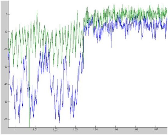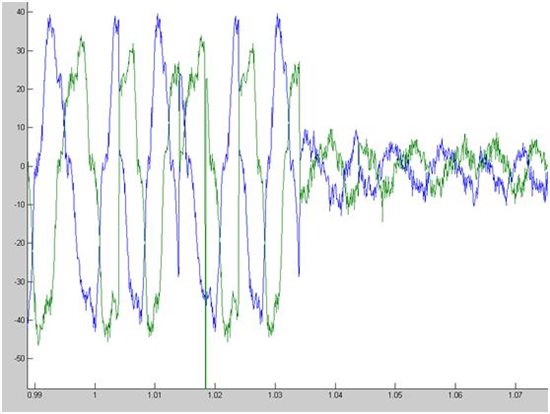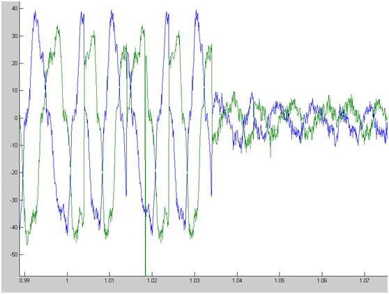 其中,蓝色为A相电流,绿色为B相电流。
