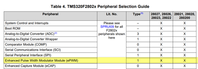 Reference Guide的Table 4. TMS320F2802x Peripheral Selection Guide则28021没有EPWM功能,这究竟哪个是对的?还有增强型的PWM和普通型的PWM是不是都带死区设置?两者死区设置有差别?从哪里可以看出?谢谢!