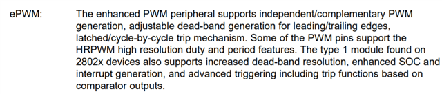 TMS320F2802x Microcontrollers datasheet (Rev. P)的Table 2-1. Hardware Features的ePWM outputs那行对应28021是具有这种功能的,但在C2000 Real-Time Control MCU Peripherals