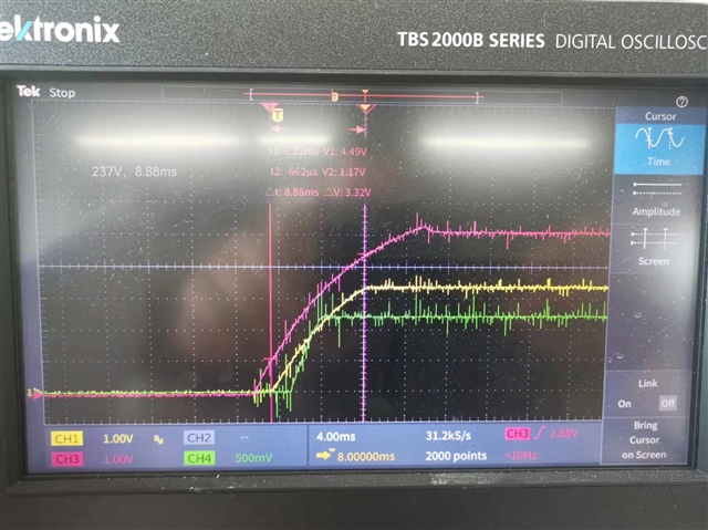 控制板上芯片电源供电路径如下:输入电源5V,5V转VDDIO 3.3V(与VDDA、VDD3VFL、VDDOSC共并在一起),VDDIO 3.3V转VDD 1.2V。实测上电波形如下: