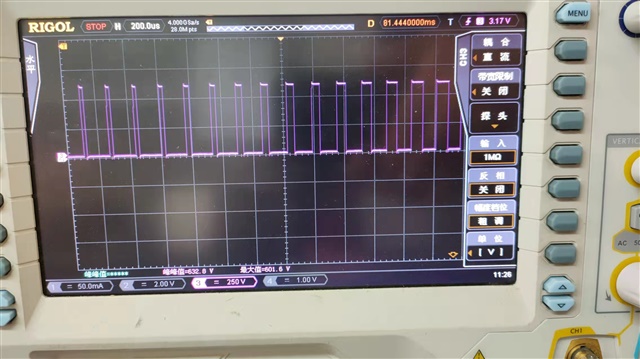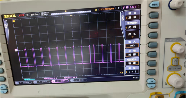 SPI连接键盘,键盘正常是12mS,发一次,异常是36mS才发一次,发现是因为时钟信号3分频了,后来发现PWM,485都有3分频现象,导致485无法通信,pwm设定6k现在变成了2k,pwm波形如下: