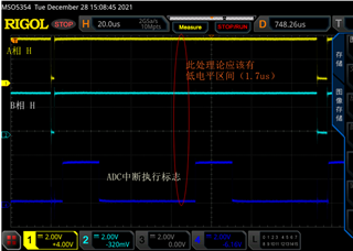 偶然发现,当某相(如A)从100%占空比周期,过渡到95%(类似值均可复现)占空比周期时,在这个95%周期的up段,理应有一个1.67us的低电平,实测发现,该低电平并未出现,进而导致电流采样为零!