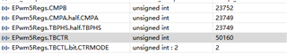 EPwm4Regs给EPwm5Regs输出同步信号,在输出同步信号时,EPwm5Regs.TBCTR加载EPwm5Regs.TBPHS.half.TBPHS的数值,然后开始增减计数,在增加到EPwm5Regs.TBPRD==25000后,应该进行减计数,但是却没有减计数,而是一直增加到了65535,很神奇,请问是需要设置某些寄存器么?