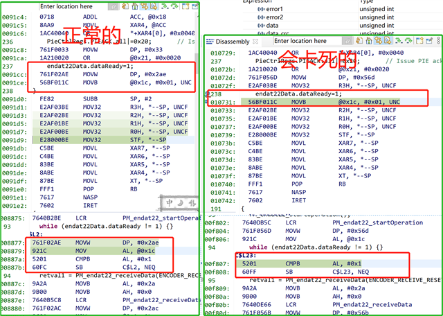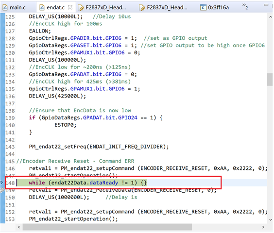 使用TMDXIDDK379D开发套件,想在例程(fcl_f2837x_tmdxiddk)中加入Endat例程(PM_endat22_BasicPosAcc_DelComp),例程加入后,程序会卡在endat.c的EnDat_Init()中的while (endat22Data.dataReady != 1) {}(具体如附图中所示);