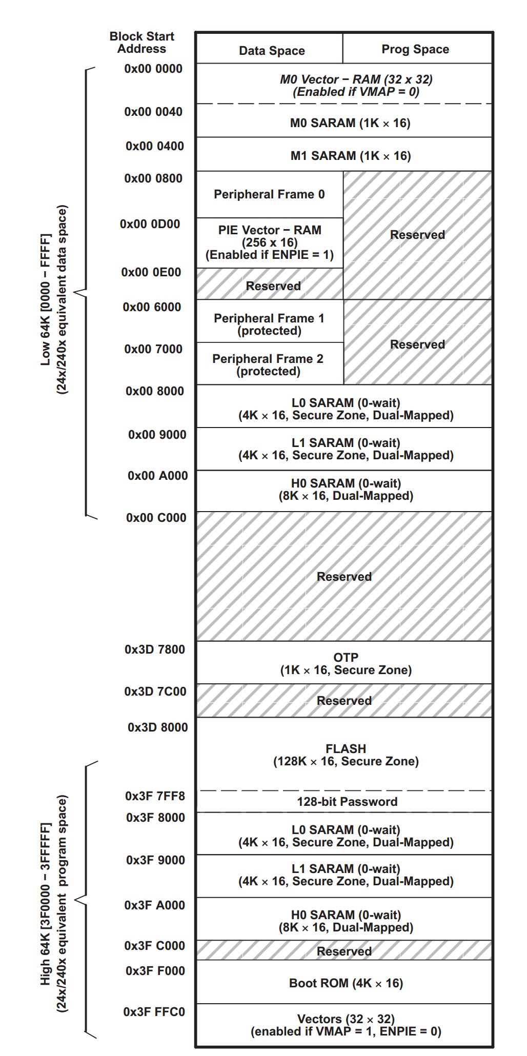 In the memory map of 2803x, there is L0 - dual mapped memory to 0x8000-0x8800 and 0x3f8000-0x3f8800. On other devices I also see such dual mapped memory.