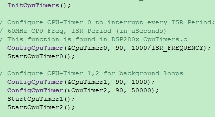 该例程采用典型的前后台架构(中断+循环),对三个定时器的使用是不一样的:Timer0用以触发中断MainISR来完成实时控制,每个中断中进行ADC采样、PWM占空比计算等;而Timer1和Timer2只是一般的外部的定时循环,不用于触发中断,只是在for循环中利用中断标志CpuTimer1Regs.TCR.bit.TIF来判断定时周期是否到了,而且定时周期较长(ms级)。配置完之后三个定时器都开始工作,只是后面两个需要等进入主循环for中后才能进行判断标志位然后进行处理,如A0、B0、A1、B1等。