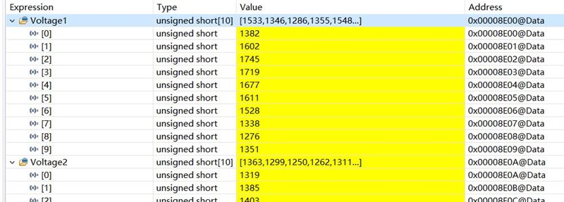 在将C2000Ware中TMS320F2803x的例程ADCSOC写进TMS320F28035最小系统板后,我用电池对 ADCINA4引脚施加了1.5伏特直流电压,可寄存器中Voltage1[10]的10个值在代码运行过程中一直固定不变,且数值也不正常,请问这是为什么呢,这个程序不是按PWM频率持续进行adc采样吗,Voltage1[10]的10个值应该是持续变化的呀,例程代码又要改的地方吗