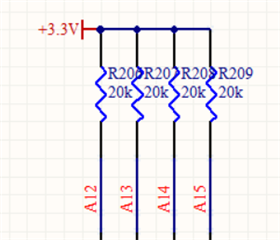 感谢您的回复,截图的意思是DSP的XA12-XA15四个引脚,通过20K的电阻,上拉到3.3V高电平,对用上电时jump to flash
