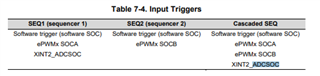 你可以看一下模块结构图,首先SEQ1INT和SEQ2INT跟ADC其实没多大关系,是用来触发DMA的。然后SOC_SEQ1和SOC_SEQ2也不在SEQ的触发源里面,触发源就下面几种: