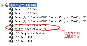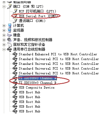 完成后拔出XDS100v3,重新将XDS100v3插到电脑上此时会重新枚举USB设置,将驱动目录指向XX..\Utilities\ftdi安装驱动成功,此时在设备管理器中可出现如下USB设备