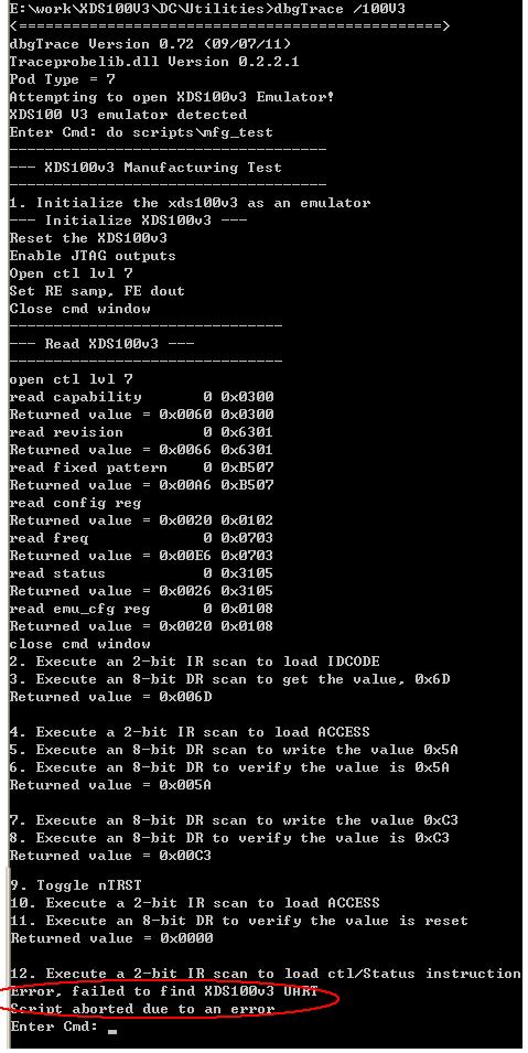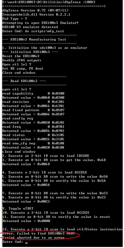 接下来拔出xds100v3并按照操作手册中描述将J2和J3进行Pin对Pin短接,此时未并连接目标板。运行生产测试程序,出现错误如下图: