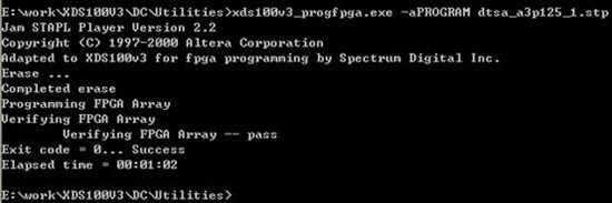 以上完成之后按照文档Instructions.pdf中的描述将v3_fpga_125.prj用Libero IDE v9.1(已打上SP5补丁)重新编译了一次,并将文件dtsa_a3p125_1.stp拷到Utilites目录下将烧录FPGA成功,Windows Xp中命令行提示如下图: