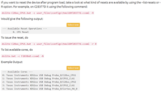 dslite-<core>.bat -c user_files\configs\tms320f28335.ccxml -R命令来查看可用的复位操作,示例输出如上图第1个灰框所示。